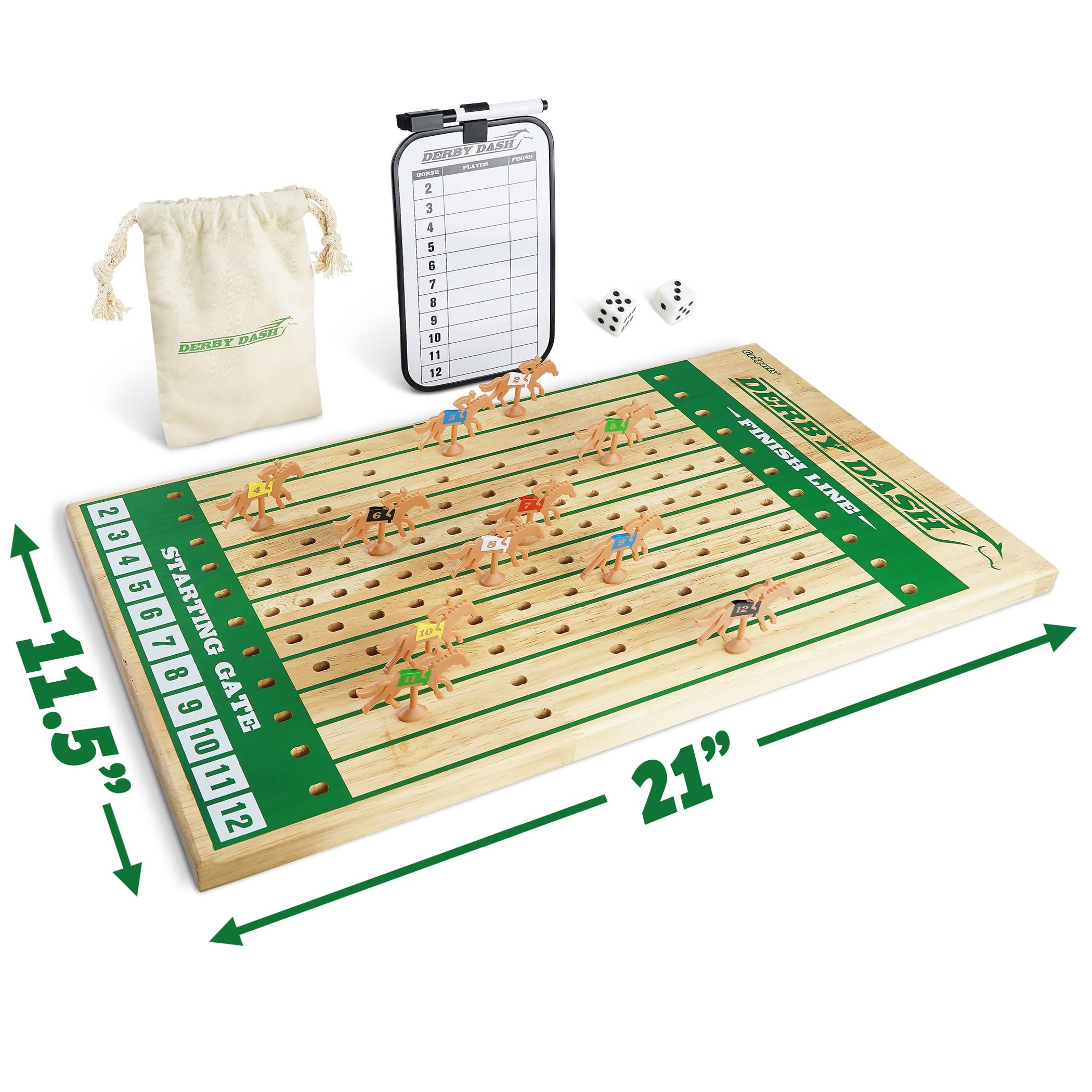 - DERBY DASH: Set includes 1 Derby Dash game board, 11 numbered race horses, 2 dice, 1 game piece pouch, and dry erase scoreboard
