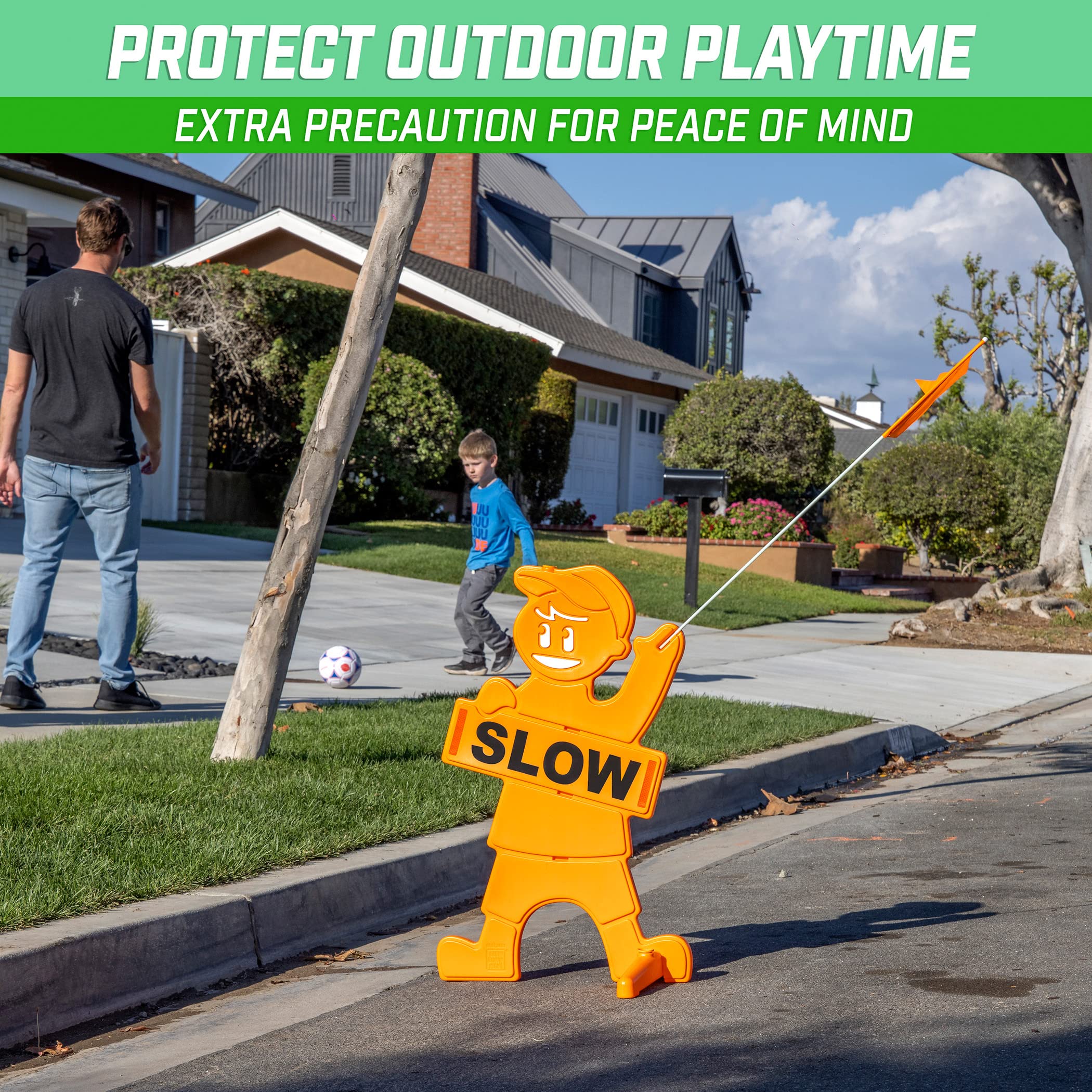 - SLOW DOWN MAN: Great for encouraging traffic safety outdoors, high visibility street safety sign alerts neighborhood motorists when children and pedestrians are present in the area; Set includes orange warning flag