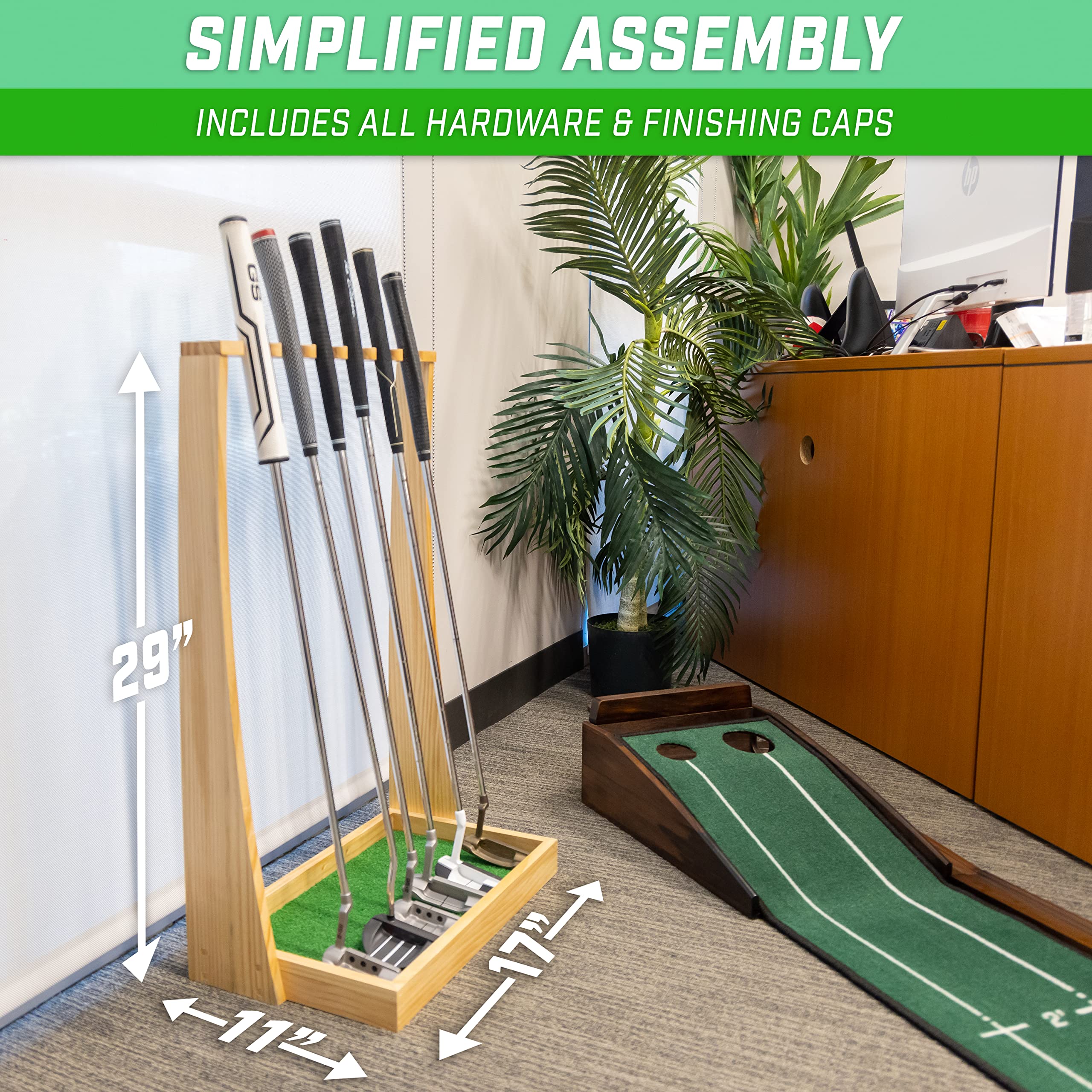 - PUTTER STAND: Premium varnished pine wood putter rack for storage and display; Fully assembled measures 29 in H x 17 in W x 11 in D