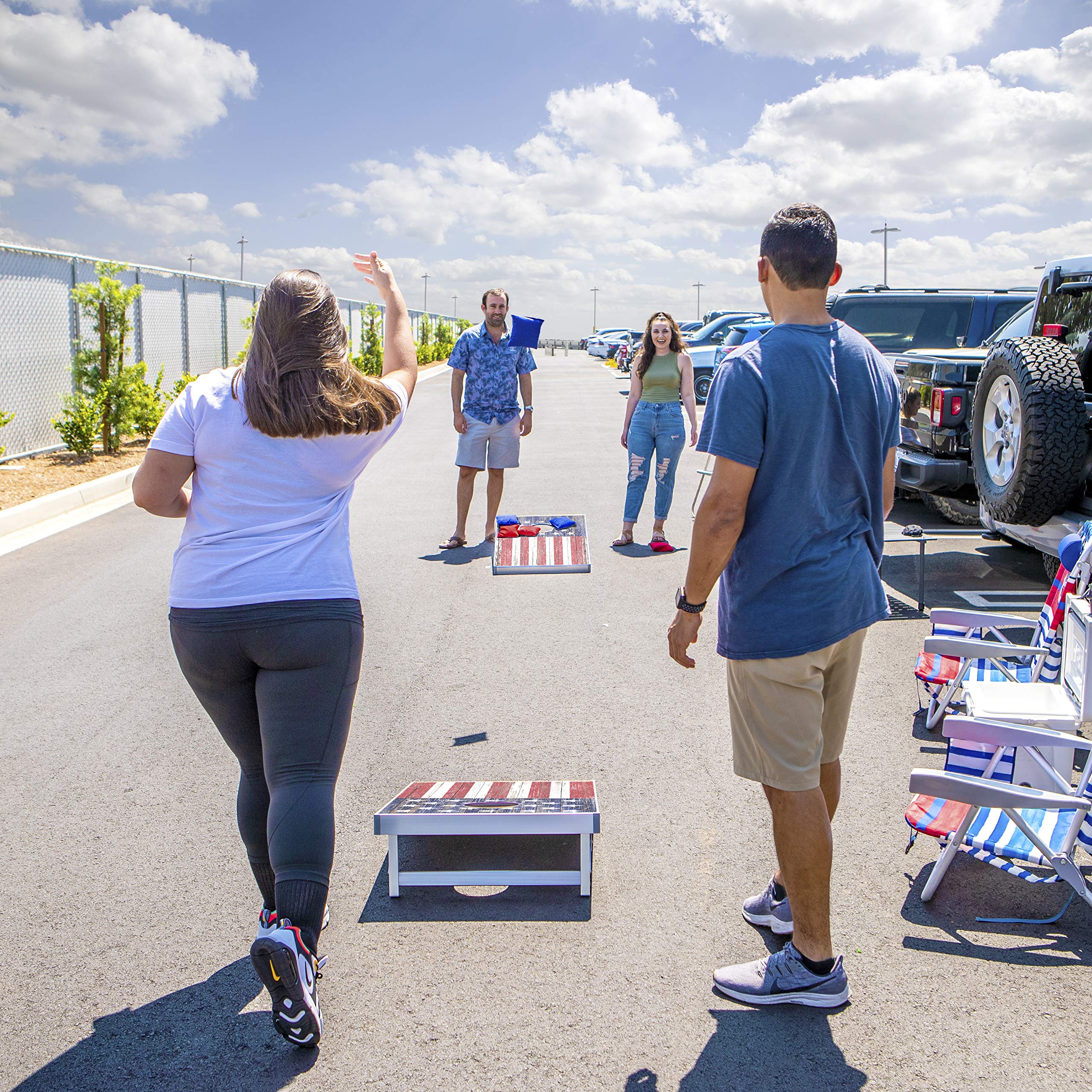 - TAILGATE SIZE: Full cornhole set includes 2 tailgate size (3 feet x 2 feet) cornhole boards, 8 all-weather regulation bean bags, premium carrying case, and rules