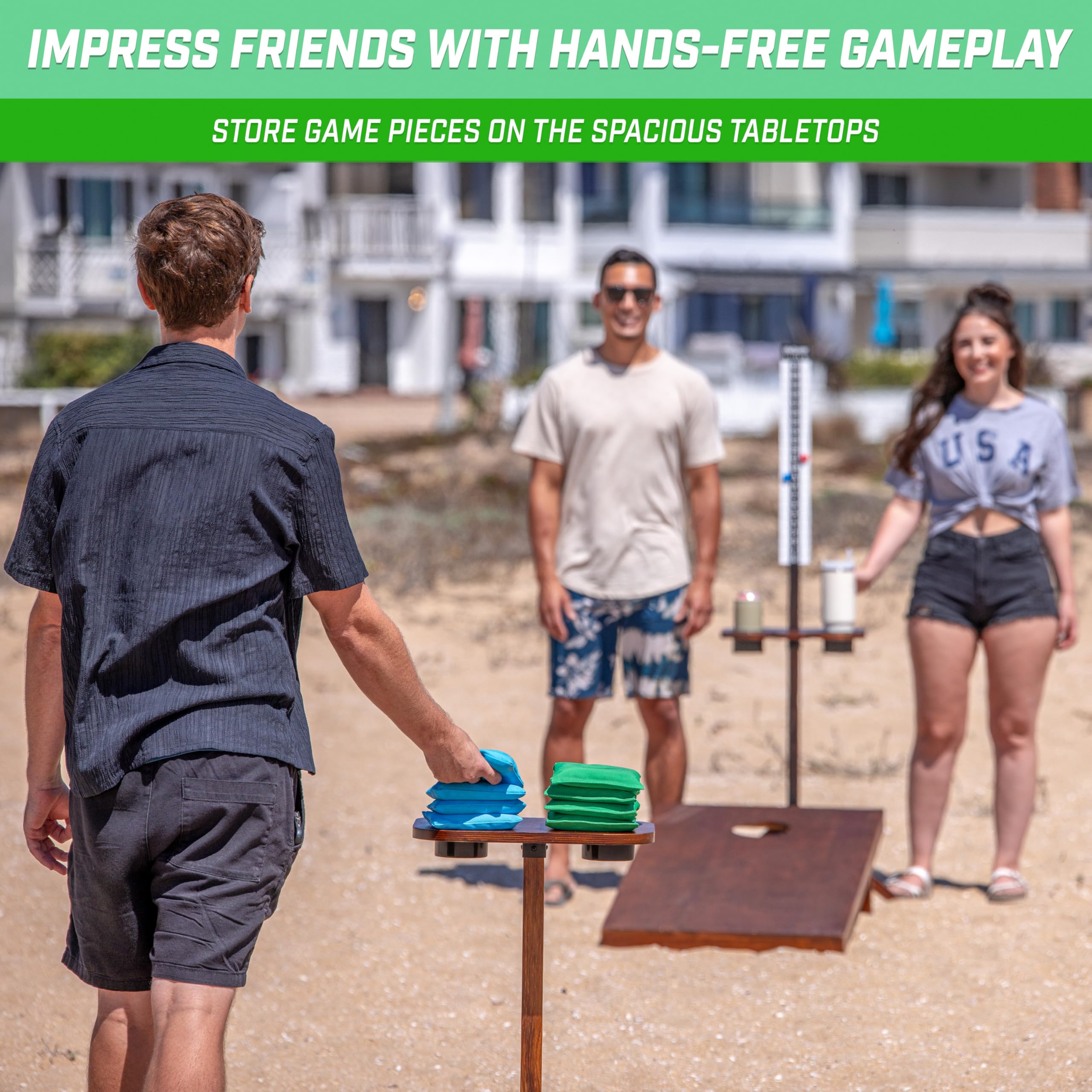 - SPACIOUS TABLES: Store your game pieces (bean bags, bolos, washers, etc) on the table to keep your hands free